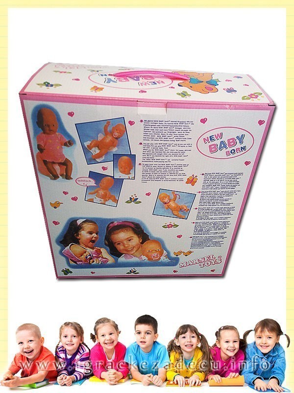Baby born lutka za decu u kompletu dobijate cuclu, flasicu, nosu, pelene, posudu za hranjenje, kasicicu i specijalnu hranu za lutku napravljenu na bazi skroba. Lutka moze da pije vodu, piski, jede kasicu i kaki. Pritiskom na levu nadlakticu cuje se zvuk a pritiskom na desnu nadlakticu lutki teku suze. Da bi tekle suze lutka mora da pije vodu. Hrana za bebu priprema se dodavanjem vode.